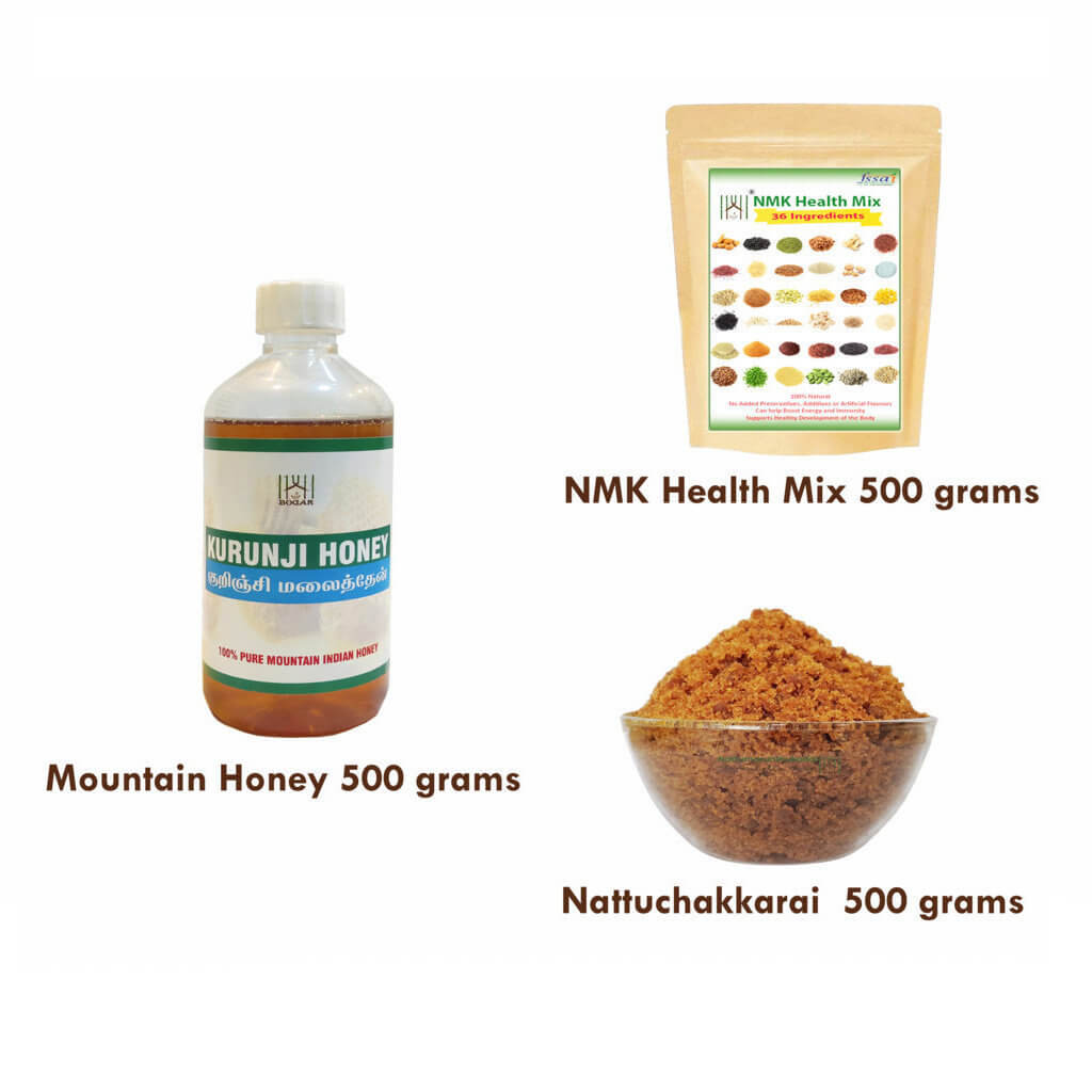 Health Combo Pack (NMK Health Mix + Nattu Chakkarai + Pure Mountain Honey)